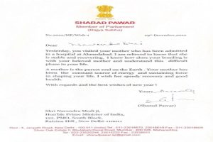 मुंबई । राष्ट्रवादी कांग्रेस पार्टी के अध्यक्ष (NCP President) शरद पवार (Sharad Pawar) ने गुरुवार को प्रधानमंत्री नरेंद्र मोदी (PM Narendra Modi) को पत्र लिखकर (By Writing A Letter) उनकी बीमार मां (Their Sick Mother) हीराबा (Heeraba) का हालचाल जाना (Inquired about the Health) । पवार ने उनके शीघ्र स्वस्थ होने और अच्छे स्वास्थ्य की कामना की।