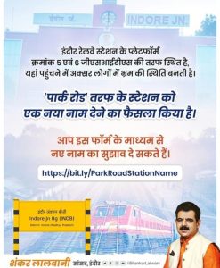 इंदौर। रेलवे द्वारा नेहरू पार्क रोड (Nehru Park Road) पर बनाने गए नए स्टेशन का नया नाम रखा जाएगा। सांसद शंकर लालवानी (MP Shankar Lalwani) ने इसकी घोषणा की है करते हुए कहा है कि नेहरू पार्क रोड स्थित रेलवे स्टेशन (railway station) का नया नाम रखा जाएगा। ये नाम जनता की राय (public opinion) पर रखा जाएगा। इसके लिए जनता एक लिंक पर अपने सुझाव दे सकती है। सांसद ने अपने सोशल मीडिया अकाउंट (social media accounts) पर संदेश के माध्यम से ये जानकारी दी है।