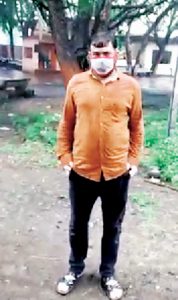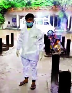 यह है शवदाह करने वाला कर्मचारी जिसका शव उतारने के दौरान न केवल किट का ऊपरी हिस्सा खुल गया बल्कि मास्क भी ऐसा पहना कि नाक का हिस्सा खुला रह गया।