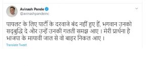 पायलट के बयान के बारे में पूछे जाने पर पांडे ने कहा, ‘‘भगवान उनको सद्बुद्धि दे, जिस पार्टी ने उनको पाला-पोसा और बड़ा किया वह उनसे एक जिम्मेदार नेता होने की अपेक्षा करती है। उनको मेरा यही संदेश है।’’ उन्होंने यह आरोप फिर दोहराया कि अशोक गहलोत सरकार को गिराने की साजिश में पायलट शामिल थे।