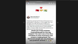 नोरा ने इंस्टाग्राम स्टोरीज पर पीएम के लिए एक संदेश साझा किया, जिसमें लिखा, “इस बड़े समर्थन के लिए प्रधानमंत्री नरेंद्र मोदी को धन्यवाद! आप जागरूकता बढ़ाने और मदद का हाथ बढ़ाने वाले पहले देशों में से एक हैं, मोरक्को के लोग बहुत आभारी हैं! जय हिंद!”