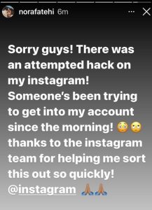 हालांकि,अब अभिनेत्री का अकाउंट रिस्टोर कर लिया गया है। सोशल मीडिया प्लेटफॉर्म से गायब हुआ नोरा का इंस्टाग्राम अकाउंट फिर से बहाल हो गया है। इस बारे में अभिनेत्री ने खुद इंस्टाग्राम पर स्टोरी शेयर करते हुए अपने फैंस को जानकारी दी। साथ ही उन्होंने यह भी बताया कि उनका अकाउंट हैक करने की कोशिश की गई थी, जिसकी वजह से अकाउंट गायब हो गया था।
