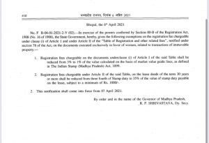 भोपाल। मुख्यमंत्री शिवराज सिंह चौहान (CM Shivraj Singh Chouhan) ने पिछले दिनों घोषणा की थी की अचल संपत्ति की रजिस्ट्री (Registry) अगर महिला (Women) के नाम पर कराई जाती है। तो उसमें 2 फ़ीसदी स्टांप ड्यूटी की छूट मिलेगी, इस घोषणा के इंतजार के बाद अब शासन ने गजट नोटिफिकेशन जारी किया है और यह 2 फीसदी की छूट देने की घोषणा कर दी है। जो आज यानी 7 अप्रैल से लागू भी हो गई है।