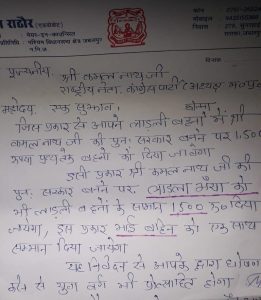 दरअसल, लेटर के माध्यम से मुकेश राठौर ने मांग की है कि लाड़ली बहना योजना की तरह लाड़ला भैया योजना की घोषणा की जाए, जिससे एक घर में बहन और भाई का समान रूप से सम्मान हो सके और इस योजना का लाभ भाइयों को भी मिल सके। मुकेश राठौर ने बताया कि इस लेटर को लेने के बाद कमलनाथ ने उन्हें आश्वासन दिया है कि इस बात को घोषणा पत्र की समिति में रखा जाएगा और इसमें क्या बेहतर हो सकता है उस पर भी काम किया जाएगा।