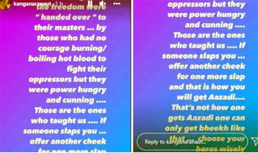 कंगना ने (Kangana Ranaut) लिखा है, ‘जो लोग आजादी के लिए लड़े उसे उन लोगों ने अपने मालिकों को सौंप दिया. क्योंकि उनमें न तो हिम्मत थी और न ही खून में उबाल. वे सत्ता के भूखे और चालाक थे. ये वही लोग थे, जिन्होंने हमें सिखाया अगर कोई तुम्हारे एक गाल पर थप्पड़ मारे तो उसके सामने अपना दूसरा गाल आगे कर दो और इस तरह तुमको आजादी मिल जाएगी. ऐसे किसी को आजादी नहीं मिलती, सिर्फ भीख मिलती है, अपने हीरो समझदारी से चुनें.’