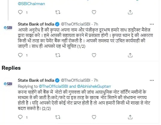 बैंक ने ट्विटर पर ग्राहक के सवाल के जवाब में कहा है कि बैंक में नोटो की गुणवत्ता की जांच अत्याधुनिक नोट सॉर्टिंग मशीनों के माध्यम से की जाती है. कटे/फटे या इस तरह के खराब नोट मिलने की संभावना नगण्य होती है. यदि आपको ऐसा कोई नोट प्राप्त होता है तो आप हमारी किसी भी शाखा से नोट बदल सकते है.