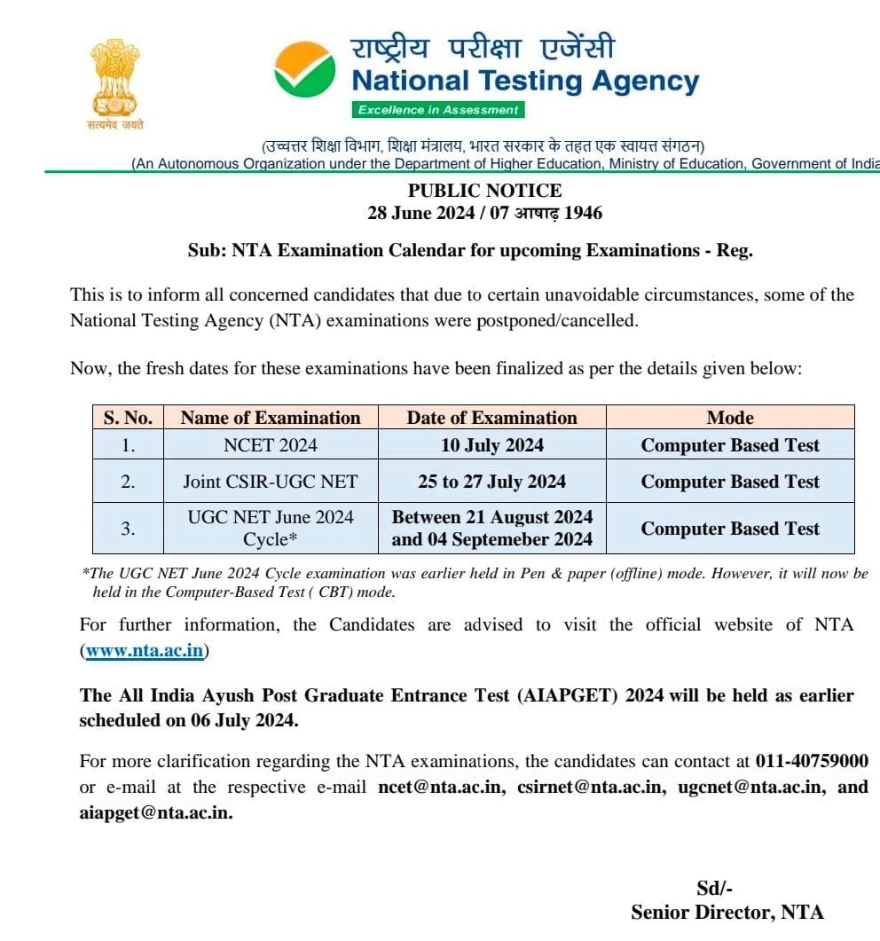 एनटीए ने शुक्रवार देर शाम को परीक्षा की तारीखों का नोटिफिकेशन जारी किया. इसमें तीन परीक्षाओं की तारीखों की घोषणा की गई है. इसमें NCET 2024, Joint CSIR-UGC NET और UGC NET June 2024 Cycle* की तारीखों का ऐलान किया गया है. ये सभी परीक्षा ऑनलाइन कराई जाएंगी.