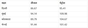 दिल्ली में पेट्रोल का दाम 95.41 रुपये जबकि डीजल का दाम 86.67 रुपये प्रति लीटर है। मुंबई में पेट्रोल की कीमत 109.98 रुपये व डीजल की कीमत 94.14 रुपये प्रति लीटर है। कोलकाता में पेट्रोल का दाम 104.67 रुपये जबकि डीजल का दाम 89.79 रुपये लीटर है। वहीं चेन्नई में भी पेट्रोल 101.42 रुपये लीटर है तो डीजल 91.44 रुपये लीटर है।