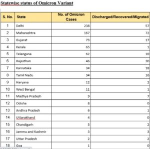 नई दिल्ली। कोरोना के नए वैरिएंट ‘ओमिक्रॉन’ ने अब देश में कोरोना संक्रमण की रफ्तार और तेज कर दिया है। स्वास्थ्य मंत्रालय द्वारा बुधवार को जारी आंकड़े के अनुसार देश में अब तक ओमिक्रॉन वैरिएंट से 781 लोग संक्रमित हो चुके हैं। 238 ओमिक्रॉन मरीजों के साथ दिल्ली एक बार फिर से टॉप पर पहुंच गई है जबकि 167 संक्रमितों के साथ महाराष्ट्र दूसरे स्थान पर है।