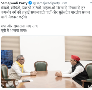 समाजवादी पार्टी(सपा) ने ट्वीट कर इसकी घोषणा की है। ट्वीट में कहा गया है, “वंचितों, शोषितों, पिछड़ों, दलितों, महिलाओं, किसानों, नौजवानों, हर कमजोर वर्ग की लड़ाई समाजवादी पार्टी और सुहेलदेव भारतीय समाज पार्टी मिलकर लड़ेंगे। सपा और सुभासपा आए साथ, यूपी में भाजपा साफ!”