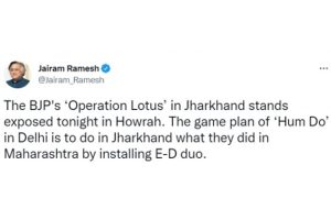 नई दिल्ली । पश्चिम बंगाल में (In West Bengal) भारी नकदी के साथ (With Huge Cash) झारखंड के तीन विधायकों (Three MLAs of Jharkhand) के पकड़े जाने के बाद (After being Caught) कांग्रेस ने आरोप लगाया है कि (Congress Alleged That) ‘ऑपरेशन लोटस’ (‘Operation Lotus’) का पदार्फाश हो गया है (Has been Exposed) । कांग्रेस ने अपनी राज्य यूनिट से रिपोर्ट मांगी है। जयराम रमेश ने ट्वीट किया, “दिल्ली में ‘हम दो’ का गेम प्लान झारखंड में वही करना है जो उन्होंने महाराष्ट्र में ई-डी जोड़ी लगाकर किया।”