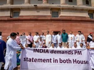 मंगलवार (25 जुलाई) को इसी मुद्दे पर विपक्षी गठबंधन ‘इंडिया’ में शामिल दलों की बैठक हुई. सूत्रों के अनुसार इस बैठक में सभी दलों ने अविश्वास प्रस्ताव लाने का फैसला किया. विपक्षी दलों ने इसके साथ ही दोनों सदनों में प्रधानमंत्री नरेंद्र मोदी के बयान की मांग जारी रखने का भी फैसला किया है. विपक्षी गठबंधन ‘इंडिया’ की आज की बैठक में सभी दल सहमत थे हालांकि टीएमसी ने अपनी राय जाहिर करने के लिए 24 घंटे का समय मांगा.
