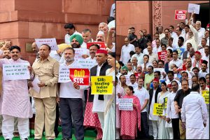 नई दिल्ली । बिहार एसआईआर मुद्दे पर (Over Bihar SIR issue) विपक्षी दलों के सदस्यों (Opposition Party Members) ने संसद के बाहर विरोध प्रदर्शन किया (Protested outside Parliament) ।