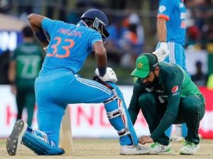 नई दिल्ली: एशिया कप (asia cup) 2023 में भारत-पाकिस्तान (India-Pakistan) मैच का इंतजार हर फैंस (Fans) को था. लेकिन बारिश की वजह से मैच को रद्द (cancel the match) करना पड़ा. टीम इंडिया (Teem India) ही सिर्फ मैच में बल्लेबाजी कर सकी. पाकिस्तान की टीम मुकाबले में एक गेंद भी नहीं खेल सकी. भले इस मैच का कोई नतीजा नहीं निकला. लेकिन इसमें कई सारे मोमेंट्स रिकॉर्ड हुए. इन्हीं में एक वो था जब पाकिस्तान के एक क्रिकेटर हार्दिक पंड्या के जूते के फीते बांधते दिखाई दिए.
