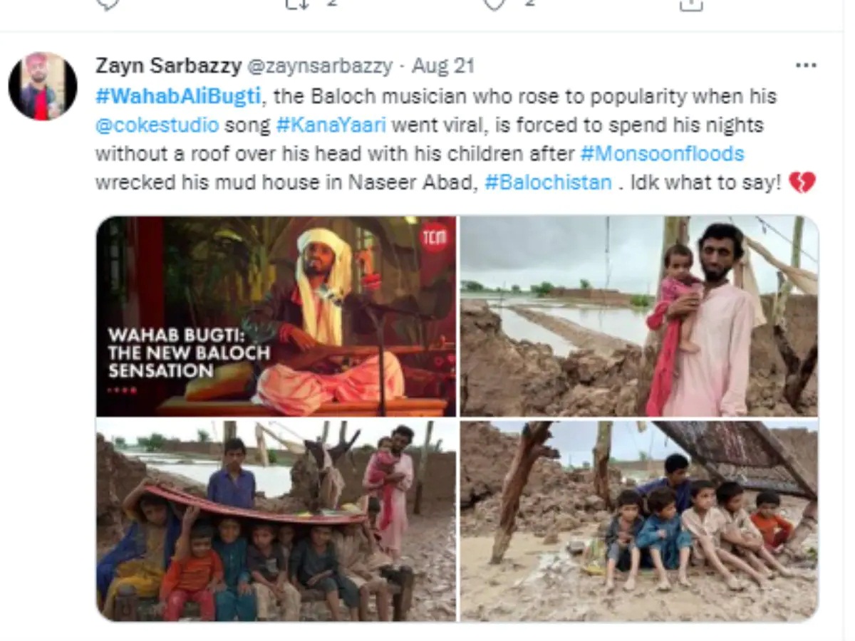 पाकिस्तान में आई इस बाढ़ ने सिंगर को बेघर कर दिया है. सोशल मीडिया पर भी वहाब की तस्वीरें सामने आई हैं, जिसके साथ लोग सिंगर की मदद की अपील कर रहे हैं. एक यूजर ने वहाब की फोटो शेयर करते हुए कैप्शन में लिखा- ‘वहाब बुगती, जो कोक स्टूडियो के सॉन्ग काका यारी से फेमस हुए थे, आज मुश्किल दौर से गुजर रहे हैं. बलोचिस्तान में आई बाढ़ में उनका भी घर बह गया है. उनका घर मिट्टी से बना था, जो तबाह हो गया है. अब वह और उनका परिवार बिना किसी छत के रह रहे हैं.’