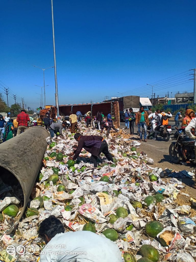 इंदौर शहर के बाहरी सीमा बाईपास पर आज दोपहर में एक ट्रक पलट गया। बताया जा रहा है कि ट्रक कनाडिया की ओर से गुजर रहा था तभी गंगा गार्डन के पास अनियंत्रित होकर पलट गया। गनीमत रही कि ट्रक जब पलटा तो कोई राहगीर वहां नहीं था। ट्रक में ओवरलोड पपीता भरा हुआ था। पलटी खाने के बाद पपीता सड़क पर बिखर गए जिसके बाद राहगीर उस पर टूट पड़े। कई राहगीर कार में तो कहीं बड़े झोले में भरकर पपीता ले गए। आसपास के ग्रामीण इलाकों में रहने वाले कुछ ग्रामीण भी यहां पपीता लेने पहुंचे थे।