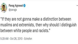 पराग ने ये ट्वीट 26 अक्टूबर 2010 को किया था और उस वक्त तक वह ट्विटर (Twitter) से नहीं जुड़े थे. अपने ट्वीट में उन्होंने लिखा था, अगर वे मुसलमानों और चरमपंथियों के बीच भेद नहीं करने वाले, तो मैं गोरे लोगों और नस्लवादियों के बीच अंतर क्यों करूं? हालांकि, अग्रवाल अपने ट्वीट में साफ किया था कि वे सिर्फ आसिफ मांडवी की पंक्तियों को शेयर कर रहे हैं, लेकिन अब उस पर बवाल हो रहा है.