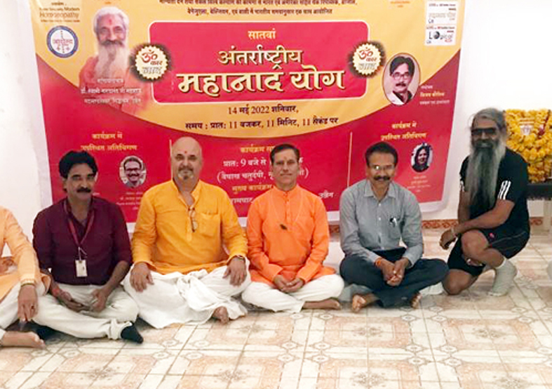 उज्जैन। युद्ध के विरुद्ध विश्व शांति एवं ग्लोबल वार्मिंग को रोकने के उद्देश्य से 14 मई 2022 शनिवार को नृसिंह जयंती के दिन भारतीय समय अनुसार प्रात: 11:11 11 सेकंड पर सातवें अंतर्राष्ट्रीय महानाद योग दिवस में भारत सहित अमेरिका, यूरोप, ब्राजील, बाली, वेनेजुएला, चेक रिपब्लिक एवं अन्य कई देशों के लोगों ने ऑनलाइन एक साथ 11 बार ओम का उच्चारण किया। विशिष्ट अतिथि शासकीय जीवाजी वेधशाला के अधीक्षक डॉ. राजेंद्र प्रकाश गुप्त ने भारतीय समय गणना प्रणाली मैं कैसे तिथियों की गणना की जाती है, इस पर अपना व्याख्यान दिया। विशेष अतिथि पंडित विजय रावल ने मंत्र चिकित्सा एवं अनुसंधान तथा वैदिक मंत्रों के प्रयोग के संबंध में महत्वपूर्ण जानकारी साझा की। ज्योतिषाचार्य एवं योग गुरु पं. बृज शर्मा ने स्वागत भाषण दिया।