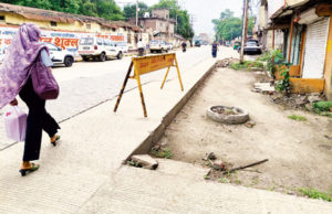 बीच सडक़ पर खम्भे, चलने को फुटपाथ नहीं