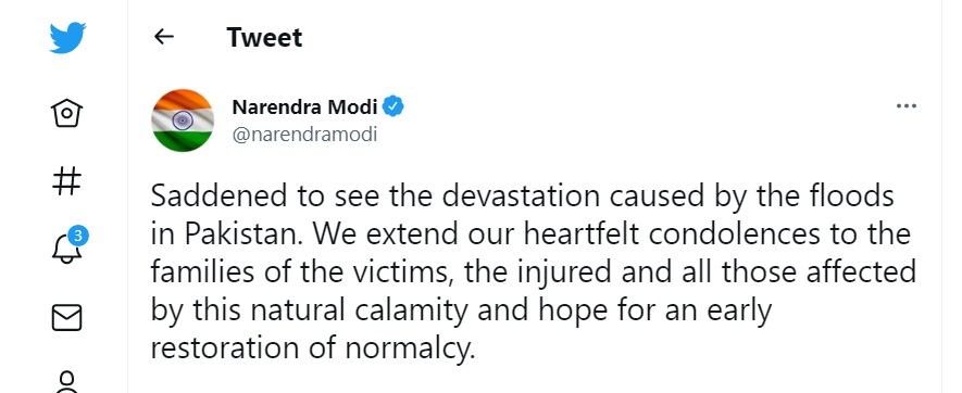 मोदी ने लिखा कि हम पीड़ितों, घायलों और इस प्राकृतिक आपदा से प्रभावित सभी लोगों के परिवारों के प्रति अपनी हार्दिक संवेदना व्यक्त करते हैं। हम यह भी उम्मीद करते हैं कि जल्द ही सामान्य स्थिति बहाल हो जाएगी। गौरतलब है कि पाकिस्तान बाढ़ से भारी तबाही का सामना कर रहा है. देश में बाढ़ और बारिश से जुड़े कारणों से अब तक 1000 से ज्यादा लोग अपनी जान गंवा चुके हैं।