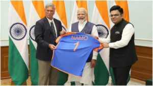 भारतीय टीम एयर इंडिया का विशेष विमान एआईसी24डब्ल्यूसी ‘एयर इंडिया चैम्पियंस 24 विश्व कप’ बुधवार को भारतीय समयानुसार सुबह चार बजकर 50 मिनट पर बारबाडोस से रवाना हुआ और 16 घंटे बिना रुके यात्रा करने के बाद गुरुवार सुबह भारतीय समयानुसार छह बजे दिल्ली पहुंचा। करीब 11 बजे सभी खिलाड़ी और हेड कोच प्रधानमंत्री नरेंद्र मोदी से मिलने उनके आवास के लिए रवाना हो गए। भारतीय टीम ने प्रधानमंत्री के 7, लोक कल्याण मार्ग स्थित आवास पर करीब दो घंटे बिताए। बीसीसीआई अध्यक्ष रोजन बिन्नी और सचिव जय शाह ने पीएम मोदी को टीम इंडिया की एक खास जर्सी दी। जिसमें नाम में नमो लिखा था, जो कि पीएम नरेंद्र मोदी के नाम को ही बता रहा है। वहीं इस जर्सी पर नंबर वन पड़ा हुआ है। इस जर्सी को पाकर पीएम मोदी भी काफी खुश नजर आए।
