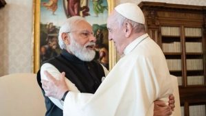 रोम। 16वीं जी20 शिखर सम्मेलन में भाग लेने इटली के दौरे पर गए प्रधानमंत्री नरेंद्र मोदी आज वेटिकन सिटी में ईसाई धर्म के सर्वोच्च नेता पोप फ्रांसिस से मुलाकात की। सूत्रों के अनुसार बैठक केवल 20 मिनट के लिए निर्धारित की गई थी, लेकिन एक घंटे तक चली।