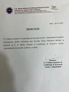 अस्पताल के मेडिकल बुलेटिन में बताया कि उन्हें कफ की प्रॉब्लम के साथ ब्लड प्रेशर भी सही नहीं था। उनकी एमआरआई की गई है। अब तबीयत में सुधार होना बताया जा रहा है। पीएम मोदी की माता की उम्र 100 साल हैं। अस्पताल के मेडिकल बुलेटिन में उनकी सेहत में सुधार की बात कही गई है। अन्य जांचें की जा रही है। परिवार के लोग उनकी सेवा में अस्पताल में ही मौजूद हैं।