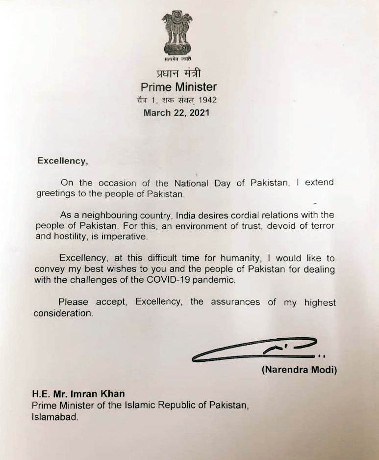 नई दिल्ली। पाकिस्तान के नेशनल डे (Pakistan National Day) पर पीएम नरेंद्र मोदी ( PM Narendra Modi ) ने प्रधानमंत्री इमरान खान (PM Imran Khan) को बधाई दी है. इसे लेकर प्रधानमंत्री नरेंद्र मोदी ( PM Modi ) ने पीएम इमरान खान (Pakistan PM Imran Khan ) को को खत लिखा है. उन्होंने खत में लिखा कि पड़ोसी देशों में भरोसे का रिश्ता होना चाहिए. आतंकवाद की कोई जगह नहीं है. भारत (India) पाकिस्तान (Pakistan ) से दोस्ताना संबंध चाहता है और दोस्ती के लिए आतंक मुक्त बहुत माहौल जरूरी है.