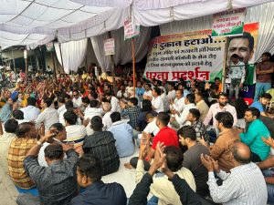 इंदौर(Indore)। बाणगंगा में मानसिक चिकित्सालय के ठीक सामने शुरू की गई शराब की दुकान को हटाने के लिए आज रविवार को एक बार फिर कांग्रेस के द्वारा आंदोलन किया गया। इस आंदोलन को देखते हुए शराब की दुकान को बचाने के लिए दुकान के सामने पुलिस छावनी बना दी गई। कांग्रेस नेता चिंटू चौकसे ने बड़ी संख्या में क्षेत्र के लोगों के साथ इस दुकान को हटाने की मांग को लेकर प्रदर्शन किया और राम जी के भजन कराए ।