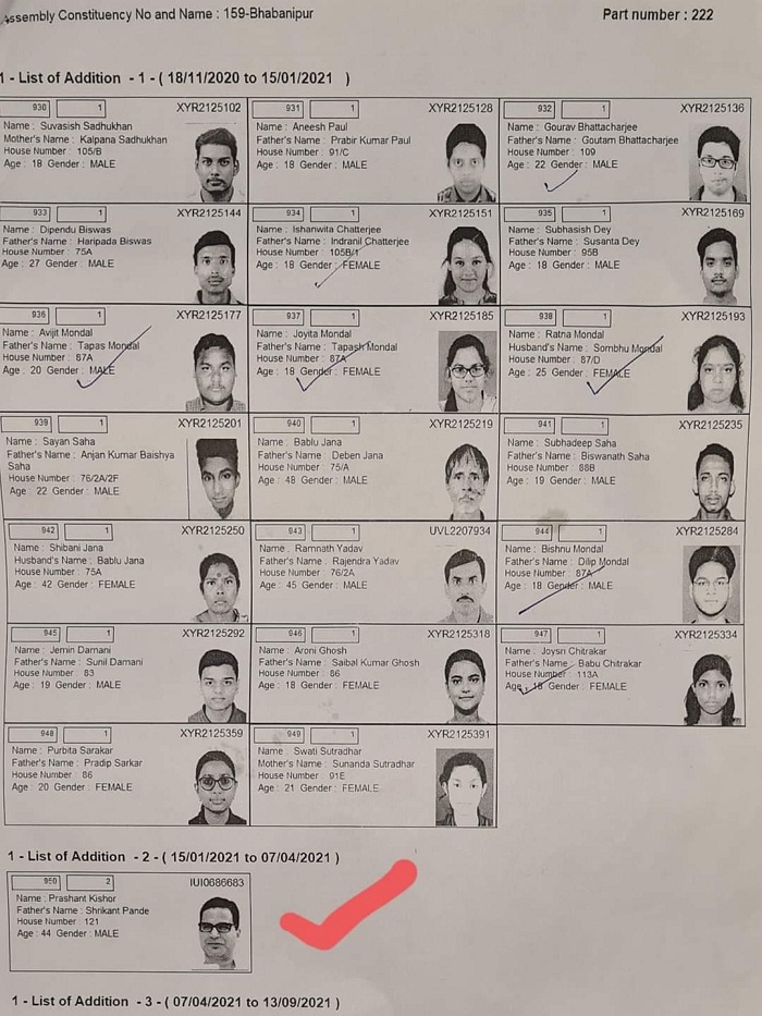 प्रशांत किशोर(Prashant Kishor), जो तृणमूल कांग्रेस (TMC)के सलाहकार रहे हैं, ने ममता बनर्जी (Mamata Banerjee) के निर्वाचन क्षेत्र भवानीपुर (Constituency Bhawanipur) से मतदाता के रूप में नामांकन कराया है. बंगाल बीजेपी ने वोटर लिस्ट की एक तस्वीर शेयर की है.
