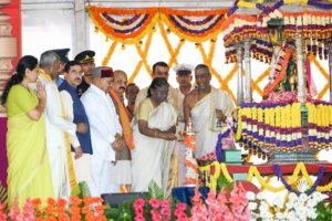 मैसूर । राष्ट्रपति द्रौपदी मुर्मू (President Draupadi Murmu) ने सोमवार को मैसूर में (In Mysore) विश्व प्रसिद्ध (World Famous) दशहरा उत्सव (Dussehra Festival) का शुभारंभ किया (Inaugurated) । उन्होंने देवी चामुंडेश्वरी के सामने (In front of Goddess Chamundeshwari) दीप प्रज्ज्वलित कर (Lighting the Lamp) पुष्पांजलि अर्पित की (Paid Floral Tributes) । दशहरे के अवसर पर कर्नाटक के लोगों को बधाई देते हुए राष्ट्रपति मुर्मू ने कहा, प्राचीन काल से ही त्योहार लोगों को आपस में जोड़ते रहे हैं। विविधता भारत के सम्मान को बढ़ाती है। कर्नाटक की आध्यात्मिक विरासत में बौद्ध धर्म, जैन धर्म की विरासत शामिल है। कलबुर्गी को सूफी संतों के केंद्र के रूप में जाना जाता है।