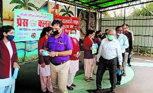 संत नगर। उपनगर में मंगलवार को प्रेस क्लब ने नवदुनिया के सौजन्य से साधु वासवानी स्कूल में विद्यार्थियों को मास्क ही अभी वैक्सीन है अभियान के तहत मास्क बांटे तथा उन्हें कोरोना से बचने के उपाय भी बताएं। इस अवसर पर सभी ने कोरोना से लडऩे की शपथ भी ली। कार्यक्रम में विशेष रूप से प्रेस क्लब के अध्यक्ष सतीश बतरा वरिष्ठ पत्रकार दिलीप मगंतानी, महेश दादलानी हीरो लालवानी, हरीश मेघानी, कमलेश वरलानी, विकास गिदवानी तथा शिक्षाविद विष्णु गेहानी साधु वासवानी स्कूल की पीआरओ दीपा आहूजा, प्राचार्य आनंद वर्मा, उप प्राचार्य स्वाति कलवानी एवं शिक्षिकाएं उपस्थित थे।