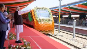 कटरा । प्रधानमंत्री नरेंद्र मोदी (Prime Minister Narendra Modi) ने कटरा-श्रीनगर वंदे भारत ट्रेन (Katra-Srinagar Vande Bharat Train) को हरी झंडी दिखाई (Flagged off) । ऑपरेशन सिंदूर की सफलता के बाद प्रधानमंत्री नरेंद्र मोदी शुक्रवार को पहली बार जम्मू-कश्मीर पहुंचे।
