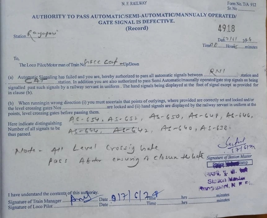 रंगपानी रेलवे स्टेशन और छत्तरहाट जंक्शन के बीच ऑटोमेटिक सिग्नलिंग सिस्टम को पार करने के लिए मालगाड़ी और कंचनजंगा एक्सप्रेस को मिले ‘पेपर लाइन क्लीयरेंस टिकट’ से पता चलता है कि दो घंटे की अवधि में दोनों स्टेशनों के बीच कम से कम 9 बार सिग्नल फेल हुआ था. आजतक ने रेलवे अधिकारियों से बात की और ओपन-सोर्स दस्तावेजों के साथ इस जानकारी की पुष्टि की कि लंबे समय तक सिग्नल खराब रहने की स्थिति में उस रूट से गुजरने वानी ट्रेनों को टी/डी912 टिकट जारी किया जाता है. वहीं रंगपानी स्टेशन मास्टर ने कंचनजंगा एक्सप्रेस ट्रेन के मामले में टी/ए912 जारी किया था.