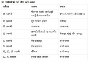 रिजर्व बैंक ऑफ इंडिया (RBI) ने फरवरी में कई दिन बैंक के बंद होने का एलान अपनी सूची में किया है। हालांकि, ऑनलाइन मोड में बैंकिंग सर्विस का इस्तेमाल कर पाएंगे। राज्यों में अलग-अलग दिन त्योहार के कारण छुट्टी रहने वाली है। कई राज्यों और शहरों में बैंक की छुट्टियां अलग-अलग होती हैं। दरअसल, बैंकिंग अवकाश विभिन्न राज्यों में मनाए जाने वाले त्योहारों या उन राज्यों में होने वाले त्योहारों पर भी निर्भर करती है।