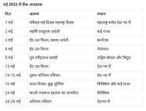 गौरतलब है कि आरबीआई कलेंडर के अनुसार्र मई महीने के पहले दिन यानी एक तारीख को मई दिवस के अवसर पर बैंक बंद रहेंगे, इस दिन महाराष्ट्र दिवस भी है। इसे अलावा कई राज्यों में दो मई को परशुराम जयंती के मौके पर बैंक अवकाश रहेगा। तीन और चार मई को इद उल फितर के मौके पर छुट्टी रहेगी।