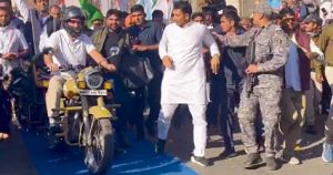 महू से राऊ पहुंची भारत जोड़ो यात्रा में अचानक राहुल गांधी ने एक चलती बाइक को रोका और चालक से हेलमेट लेकर खुद बाइक चलाई। इस दौरान पूर्व मंत्री और क्षेत्रीय विधायक जीतू पटवारी दौड़ लगाते नजर आए।