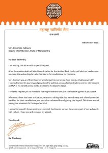 डिप्‍टी सीएम देवेंद्र फड़णवीस को लिखी चिट्ठी में राज ठाकरे ने कहा, ‘रमेश लटके के निधन के बाद उनकी पत्‍नी का उन्‍हीं के विधानसभा क्षेत्र से विधायक निर्वाचित होना दिवंगत नेता की आत्‍मा को बड़ी सांत्‍वना होगी. ऐसे में मैं आपसे आग्रह करता हूं कि आप उपचुनाव में न उतरें और न ही ऋतुजा लटके के खिलाफ कोई प्रत्‍याशी उतारें.’ राज ठाकरे के इस पत्र सियासी गलियारों में चर्चाओं का दौर शुरू हो गया है.