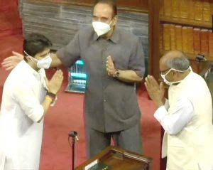 इस दौरान राज्यसभा में दिलचस्प नजारा सामने आया। जब सभी सांसद शपथ ले रहे थे तो एक मौका ऐसा भी आया जब ज्योतिरादित्य सिंधिया और दिग्विजय सिंह का आमना-सामना हुआ। दोनों ने मास्क पहना हुआ था। जब सिंधिया और दिग्विजय का सामना हुआ तो दोनों ने एक-दूसरे के सामने हाथ जोड़कर अभिवादन किया। दोनों नेता जब एक दूसरे का अभिवादन स्वीकार रहे थे उस वक्त वहां राज्यसभा में नेता विपक्ष और कांग्रेस सांसद गुलाम नबी आजाद भी मौजूद थे। गुलाम नबी आजाद भी हाथों से कुछ इशारा करते हुए दिखाई दिए।