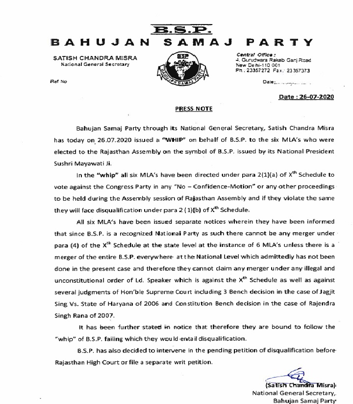पार्टी पदाधिकारियों द्वारा बताया गया कि बसपा ने ये व्हिप अपने छह विधायकों जेएस अवाना, संदीप कुमार, वाजिब अली, लखन सिंह, दीप चंद, आर गुढ़ा को जारी किया है.बहुजन समाज पार्टी के जनरल सेक्रेट्री सतीश चंद्र मिश्रा ने अपनी पार्टी के सभी 6 विधायकों को निर्देश देते हुए कहा है कि, राजस्थान में सियासी संकट के बीच बहुजन समाज पार्टी के सभी छह विधायकों को अलग-अलग एक साथ नोटिस भेजा गया है.