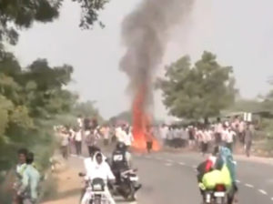 नरेश के समर्थकों ने गांव से निकलने वाले हाईवे को ब्लॉक कर दिया है. वहां पत्थरों को तोड़-तोड़कर पत्थरबाजी कर रहे थे. उन्होंने रोड पर ट्रैक्टर और ट्रकों के पहियों को रोड पर रखकर उसमें आग लगा दी. इतना ही ट्रैक्टर के हलों को रखकर रोड को जाम कर दिया गया है.