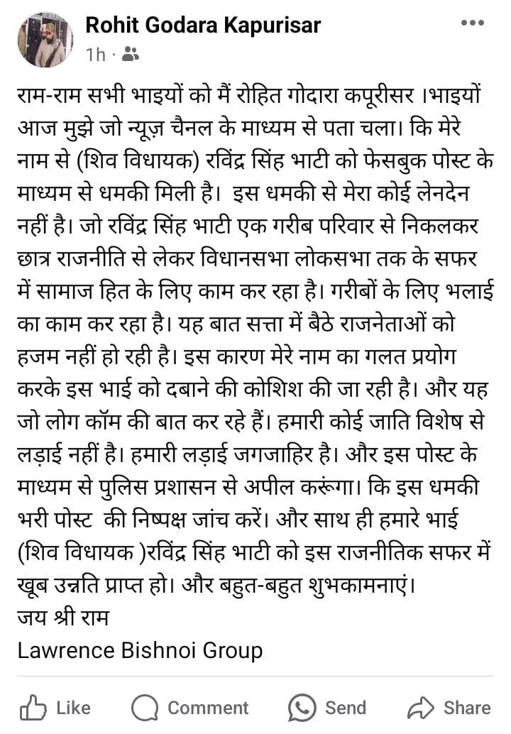 गैंगस्टर रोहित गोदारा ने लिखा है, ”मेरे नाम से (शिव विधायक) रविंद्र सिंह भाटी को फेसबुक पोस्ट के माध्यम से धमकी मिली है. इस धमकी से मेरा कोई लेनदेन नहीं है. रविंद्र भाटी एक गरीब परिवार से निकलकर छात्र राजनीति से लेकर विधानसभा लोकसभा तक के सफर में समाज हित के लिए काम कर रहा है. गरीबों के लिए भलाई का काम कर रहा है. यह बात सत्ता में बैठे राजनेताओं को हजम नहीं हो रही है. इस कारण मेरे नाम का गलत इस्तेमाल करके भाई को दबाने की कोशिश की जा रही है. हमारी कोई जाति विशेष से लड़ाई नहीं है. हमारी लड़ाई जगजाहिर है. इस पोस्ट के जरिए पुलिस प्रशासन से अपील करूंगा कि इस धमकी भरे पोस्ट की निष्पक्ष जांच करें.” इसके साथ ही रोहित गोदारा ने रविंद्र सिंह भाटी के उज्ज्वल राजनीतिक भविष्य की शुभकामनाएं दी हैं.