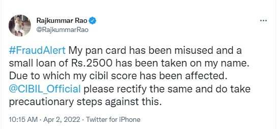 अभिनेता राजकुमार राव का कहना है कि उनके पैन कार्ड का दुरुपयोग करके धोखे से लोन लिया गया है, जिसकी वजह से उनका क्रेडिट स्कोर भी प्रभावित हुआ है। अब इस पूरे मामले पर उन्होंने ट्विटर के जरिए पोस्ट कर क्रेडिट इंफॉर्मेशन ब्यूरो (इंडिया) लिमिटेड (CIBIL) के अधिकारियों से इस मामले को देखने के लिए कहा।