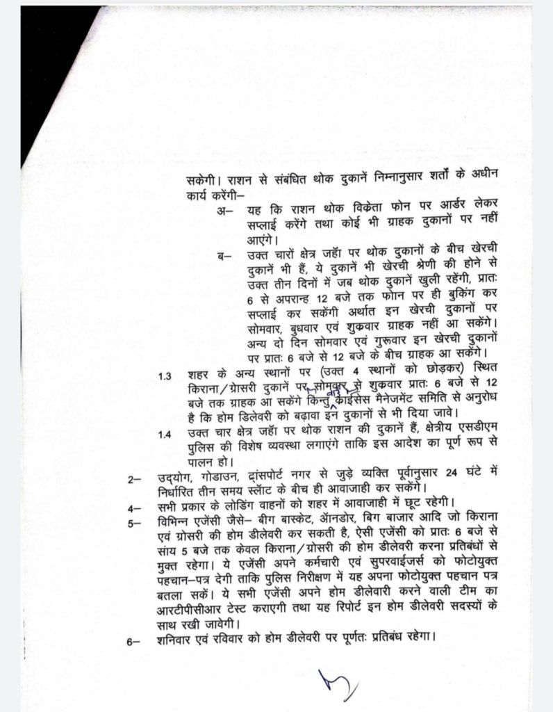 इन्दौर। कलेक्टर मनीष सिंह ने शहर में चल रहे हैं कोरोना कर्फ्यू (Corona Curfew) को 29 मई तक बढ़ा दिया है वहीं कुछ राहत अपने आदेश में दी है। इनमें अब शहर की राशन दुकान (Ration Shops) सोमवार से शुक्रवार तक सुबह 6:00 बजे से 12:00 बजे तक खुली रहेगी। हालांकि इसमें थोक दुकानें शामिल नहीं रहेंगी। किराना सामान के थोक बाजार सियागंज, मालवामिल, मल्हारगंज और छावनी सोमवार, बुधवार और शुक्रवार को सुबह 6:00 बजे से 1:00 बजे तक खुले रहेंगे, लेकिन यहां ग्राहकों की भीड़ नहीं होगी। ऑर्डर के अनुसार माल की होम डिलीवरी (home delivery) करना होगी। वही राशन दुकानों से ऑनलाइन सामान मंगाया जा सकेगा लेकिन डिलीवरी ब्वॉय को कोरोना नेगेटिव (Corona Negative) होने की आरटीपीसीआर रिपोर्ट (RT-PCR) रखना होगी। इन्हें शनिवार और रविवार छोड़कर सुबह 6 से शाम 5 बजे तक का समय दिया गया है।