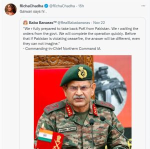 दरअसल उत्तरी सेना के कमांडर लेफ्टिनेंट जनरल उपेंद्र द्विवेदी ने मंगलवार को कहा था कि भारतीय सेना पाकिस्तान के कब्जे वाले कश्मीर को वापस लेने जैसे आदेशों को पूरा करने के लिए तैयार है। इसी बयान को कोट करते हुए ऋचा चड्ढा ने ट्विटर पर लिखा, ‘गलवान हाय कह रहा है’। इसके बाद भाजपा के नेता मनजिंदर सिंह सिरसा ने ट्वीट कर कहा है, ‘अपमानजनक ट्वीट। इसे जल्द वापस लिया जाना चाहिए, हमारे सशत्र बलों का अपमान करना उचित नहीं है’।