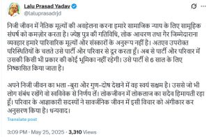 यह फैसला राजनीतिक हलकों में गहरी चर्चा का विषय बन गया है, क्योंकि इसे लालू परिवार के भीतर बढ़ती कलह और पार्टी की आंतरिक संरचना पर इसके संभावित प्रभावों के रूप में देखा जा रहा है। लालू प्रसाद यादव ने ‘एक्स’ (पूर्व में ट्विटर) पर एक पोस्ट के माध्यम से इस फैसले की घोषणा की। उन्होंने लिखा, “निजी जीवन में नैतिक मूल्यों की अवहेलना करना हमारे सामाजिक न्याय के लिए सामूहिक संघर्ष को कमज़ोर करता है। ज्येष्ठ पुत्र की गतिविधि, लोक आचरण तथा गैर जिम्मेदाराना व्यवहार हमारे पारिवारिक मूल्यों और संस्कारों के अनुरूप नहीं है। अतएव उपरोक्त परिस्थितियों के चलते उसे पार्टी और परिवार से दूर करता हूं। अब से पार्टी और परिवार में उसकी किसी भी प्रकार की कोई भूमिका नहीं रहेगी। उसे पार्टी से 6 साल के लिए निष्कासित किया जाता है।”