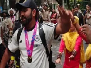 रोहित शर्मा का एक वीडियो सोशल मीडिया पर तेजी से वायरल हो रहा है जिसमें वह डांस करते हुए नजर आ रहे हैं. रोहित के साथ पूरी टीम इंडिया भी दिखाई दे रही है. रोहित ढोल की बीट पर थिरकते हुए नजर आ रहे हैं. वीडियो को काफी पसंद किया जा रहा है. बता दें कि पूरी टीम इंडिया 11 बजे प्रधानमंत्री नरेंद्र मोदी से उनके आवास पर मुलाकात करेगी और बाद में होटल वापस जाएंगे. उसी दिन यानी आज शाम 4 बजे पूरी टीम मुंबई के लिए भी जाएगी.