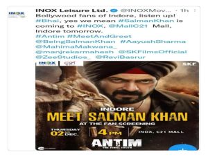 इंदौर। 26 नवंबर को रिलीज हुई फिल्म अंतिम (Antim) के प्रमोशन के सिलसिले में बॉलीवुड अभिनेता सलमान खान (bollywood actor salman khan) ) गुरुवार को अपनी जन्मभूमि इंदौर आ रहे हैं। सलमान इंदौर (Indore) के सी-21 मॉल (C-21 Mall) में बने आईनॉक्स मल्टीप्लेक्स (Inox Multiplex) में अपने फैन्स से रूबरू होंगे और फैन्स स्क्रीनिंग इवेंट में हिस्सा लेंगे। आईनॉक्स के ऑफिशियल ट्वीटर हैंडल से जारी किए गए ट्वीट के माध्यम से यह जानकारी प्राप्त हुई है। कार्यक्रम का समय शाम 4 बजे रखा गया है। हालांकि ट्वीट में यह स्पष्ट नहीं है कि सलमान अकेले आएंगे या उनके साथ फिल्म अंतिम की पूरी स्टार कास्ट भी इंदौर आएगी। लेकिन यह माना जा रहा है कि सलमान के साथ उनके को-स्टार आयुष शर्मा, महिमा मकवाना और महेश मांजरेकर (Aayush Sharma, Mahima Makwana, Mahesh Manjrekar) भी इस इवेंट का हिस्सा बन सकते हैं।