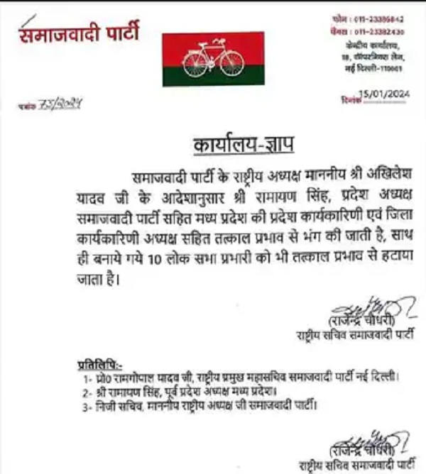 दरअसल, समाजवादी पार्टी ने सोमवार को ही उत्तर प्रदेश से लगी मप्र की 10 लोकसभा सीटों के लिए प्रभारी नियुक्त किए थे, लेकिन कुछ घंटों बाद पार्टी के राष्ट्रीय अध्यक्ष अखिलेश यादव ने लोकसभा प्रभारियों की नियुक्ति सहित सपा की प्रदेश कार्यकारिणी भंग कर दी है। पार्टी द्वारा जो आदेश जारी किया गया है, उसमें लिखा है कि समाजवादी पार्टी के राष्ट्रीय अध्यक्ष अखिलेश यादव के आदेशानुसार पार्टी के प्रदेश अध्यक्ष रामायण सिंह सहित मध्य प्रदेश की प्रदेश कार्यकारिणी एवं जिला कार्यकारिणी अध्यक्ष सहित तत्काल प्रभाव से भंग की जाती है। साथ ही बनाये गये 10 लोकसभा प्रभारी को भी तत्काल प्रभाव से हटाया जाता है।