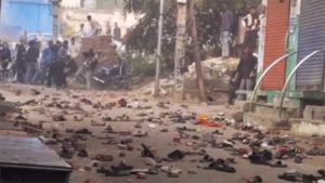हिंसा में सड़क पर बिखरे चप्पल, ईंटें और पत्थर